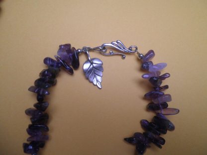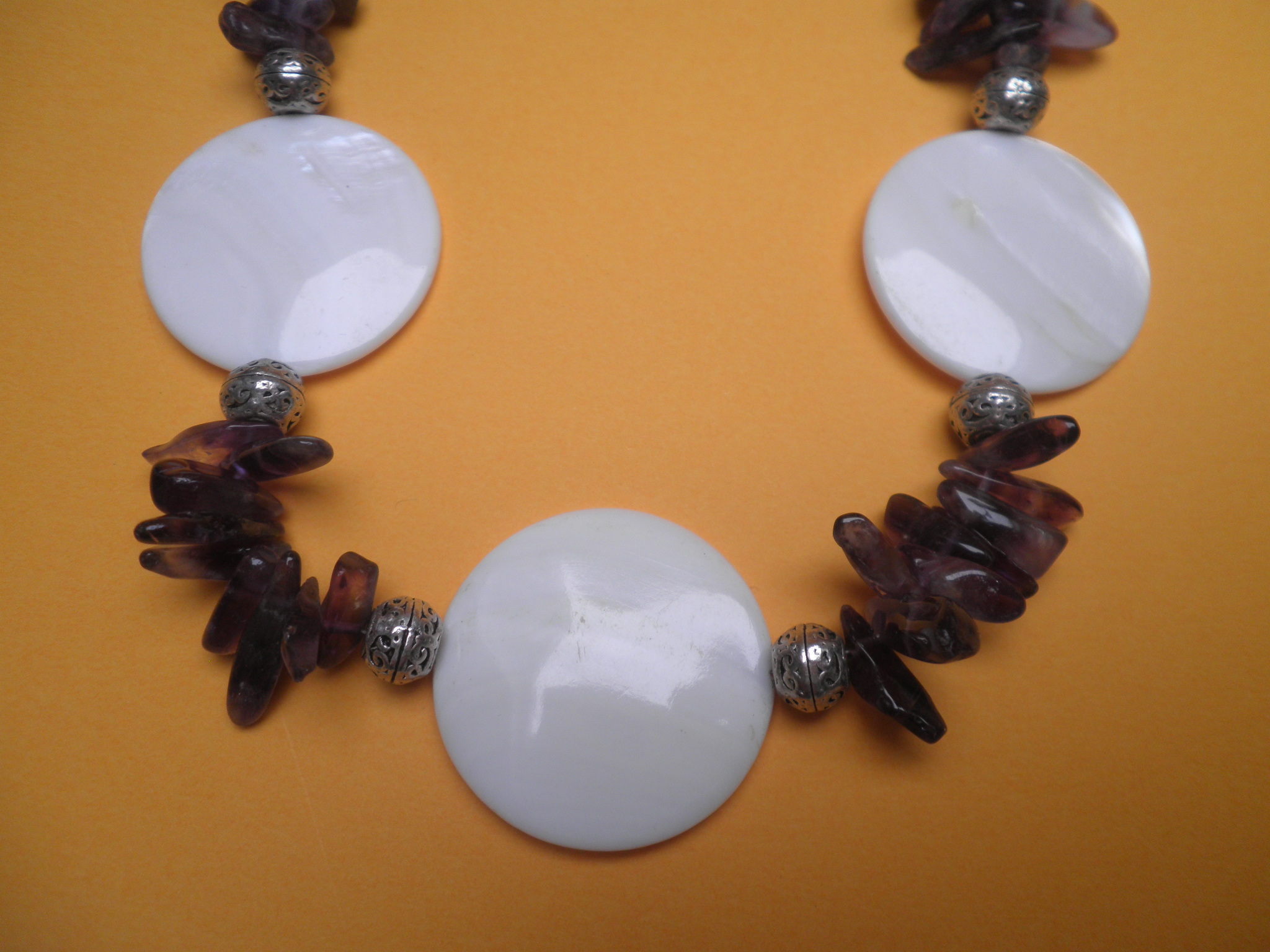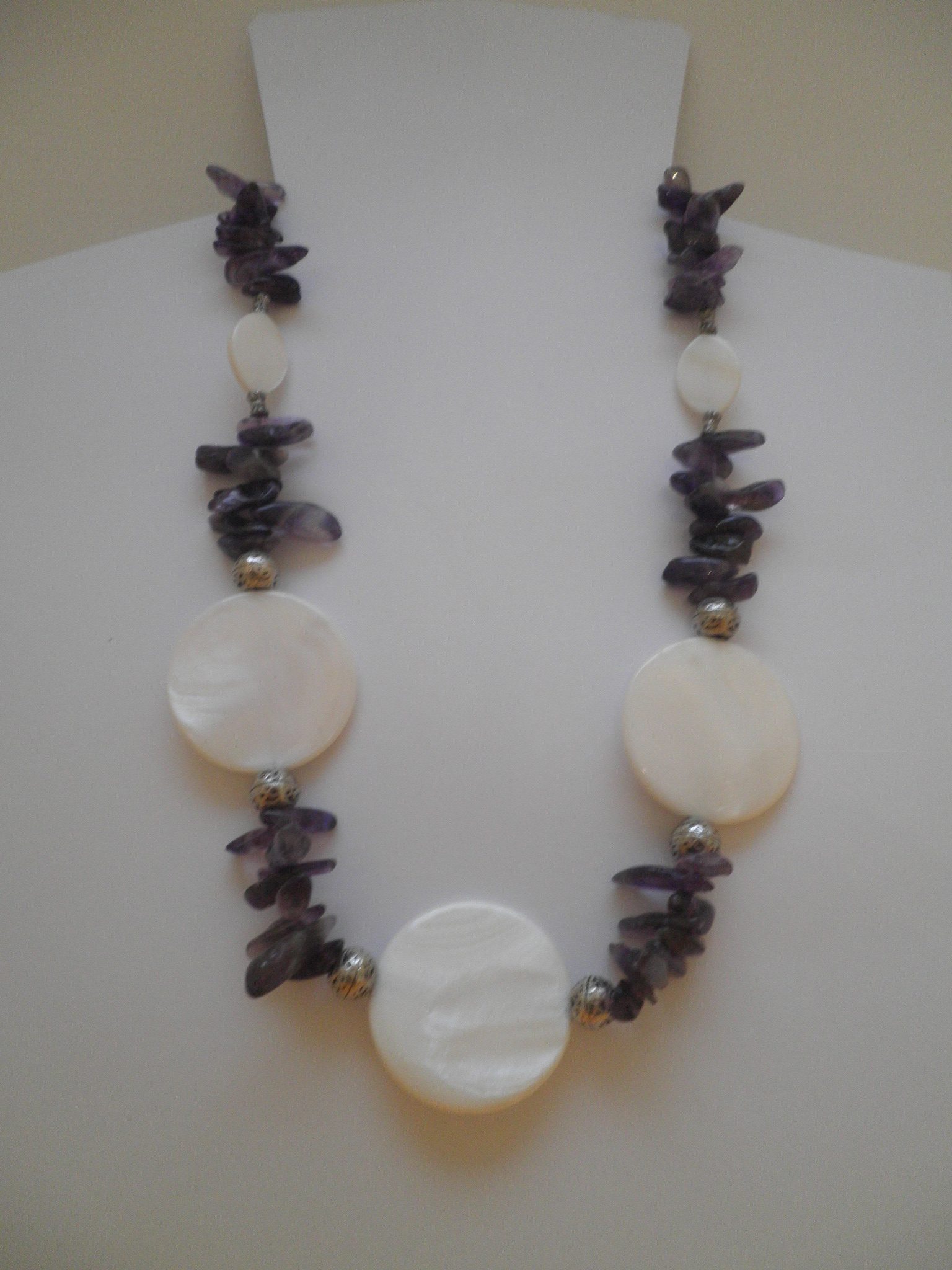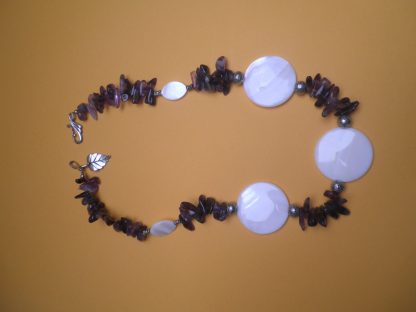 Amethyst chips with round white shells. Sterling silver connectors, clasp and charm. Combination of purple and white beads.